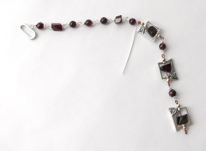 For awhile now, I've noticed finished jewelry made with mixed metals (silver and brass, gunmetal and gold, pewter and brass, etc.). It's a trend that seems to keep growing, which is great since I love the look of it all. Here's a necklace that's mostly silver with just touches of gold mixed in, in the forms of wire and crimp findings. Garnet stones in round and faceted shapes and simple silver bead frames add elegance and drama to an otherwise simple-to-assemble necklace. There are lots of steps in this necklace, but they're all pretty basic. This piece would be lovely made in just about any color palette and mixture of metals.
